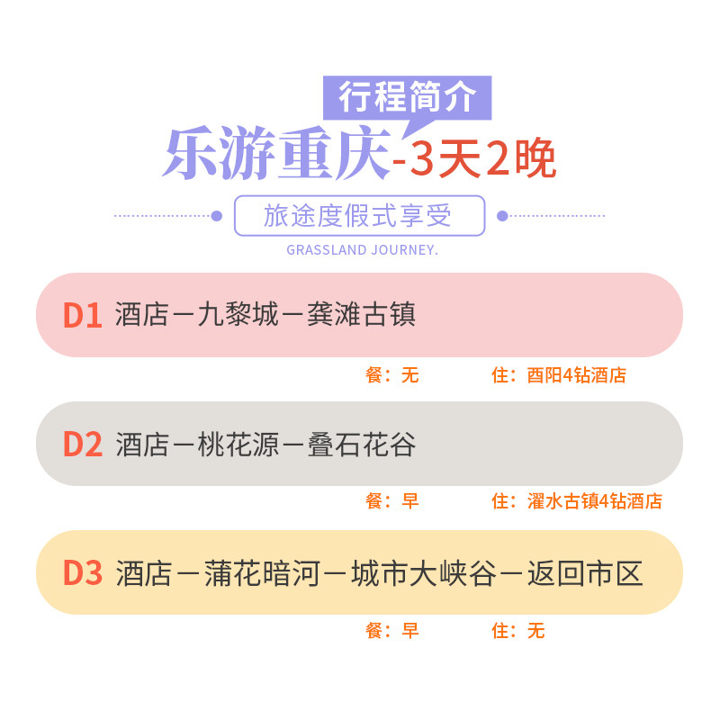 专为周末或小长假差旅设计,3天2晚行程完美嵌入周五晚至周日返程的时间框架,或利用周三至周五的碎片假期。无需请长假,即可深入渝东南腹地,打卡九黎城苗族风情、漫步桃花源落英缤纷小径、夜宿龚滩吊脚楼。短时高效,让差旅不再只是奔波,而是身心充电的契机。