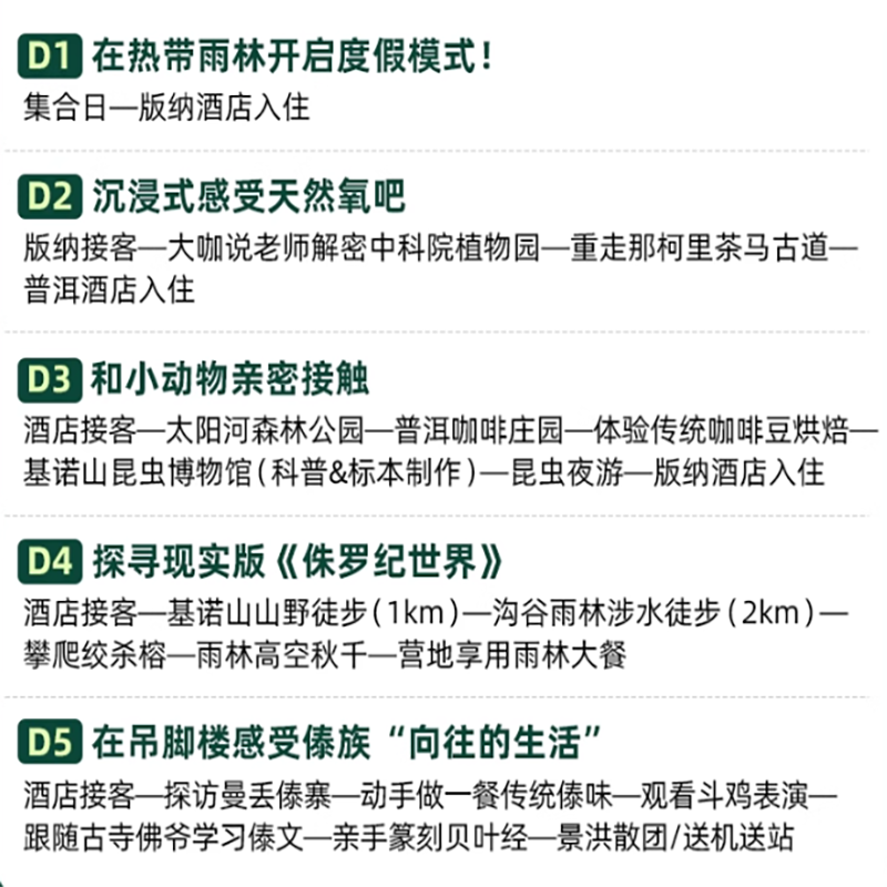 本行程支持单人预订,无需拼团等待,特别适合商务人士在差旅间隙灵活安排短途度假。无论是临时调休还是会议结束后的放松时光,您都可以即刻启程,深入西双版纳热带雨林,享受5天4晚的亲子自然之旅,兼顾效率与休闲,真正实现“说走就走”的差旅度假体验。