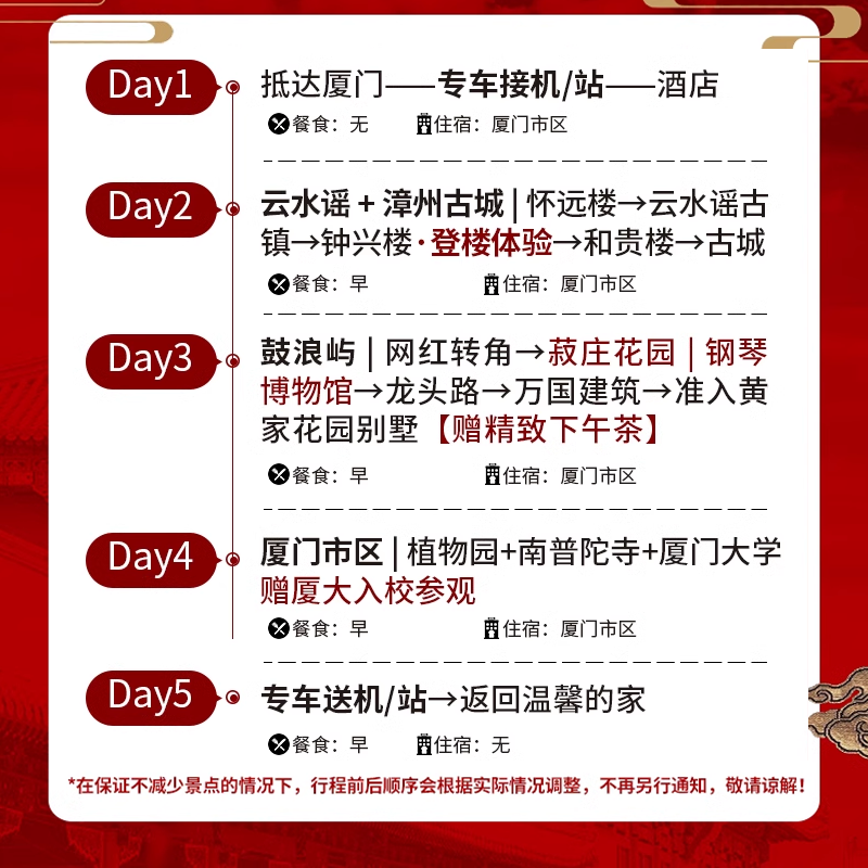 行程科学串联厦门与漳州两大目的地,利用两地仅1小时车程的地理优势,打造高效差旅动线。无论是从厦门高崎机场抵达,还是后续转往漳州商务洽谈,本线路均能实现景点游览与差旅任务的无缝对接,最大化时间利用率。