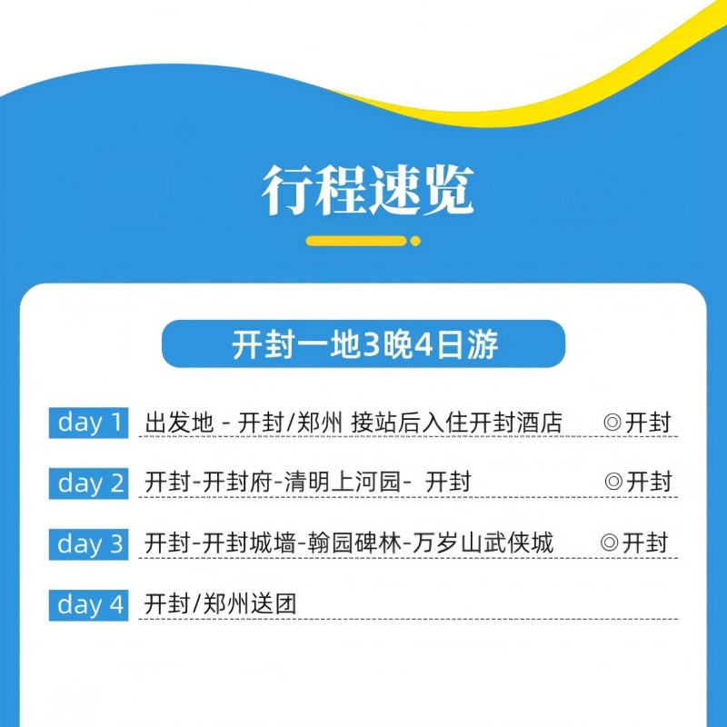 4天3晚的行程安排科学合理,覆盖开封核心景点而不显仓促,特别适合利用周末或短假期进行差旅延伸。无论是周五下班后出发、周一返程,还是利用项目间隙短暂休整,该行程都能高效衔接工作日程。每个景点停留时间充足,交通衔接顺畅,确保差旅人士在有限时间内获得最大化的文化与休闲价值。