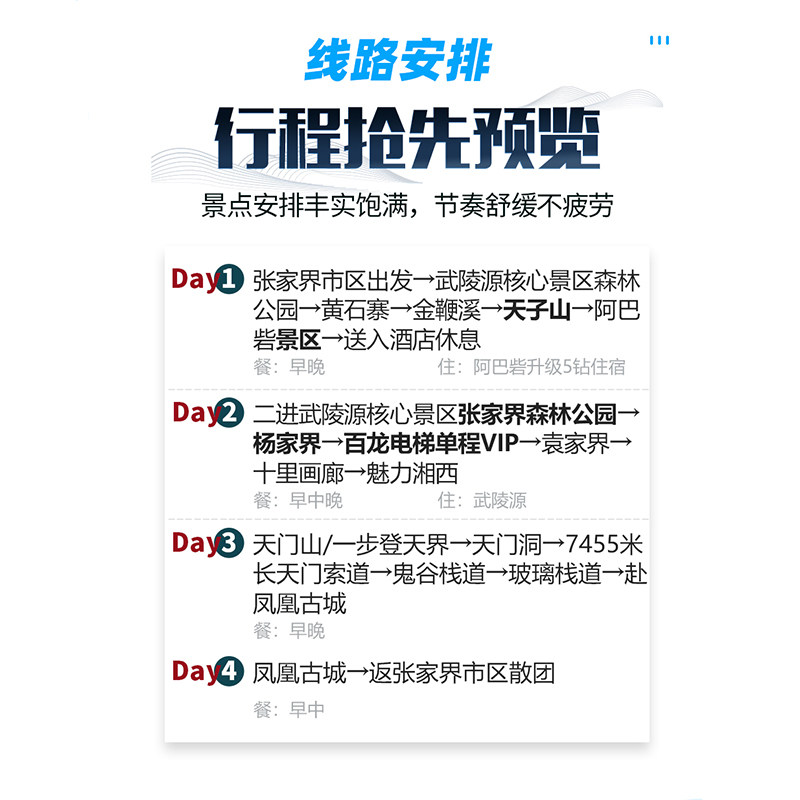 专为时间有限的差旅人群设计,4天3晚行程科学规划张家界国家森林公园与凤凰古城两大世界级目的地。无需冗长假期,即可在周末加两天年假轻松完成一次高价值旅行。全程交通、住宿、门票、导览一价全含,免除自行订票、转车、排队烦恼,让差旅后的休闲时光真正用于放松与探索,而非琐碎安排。