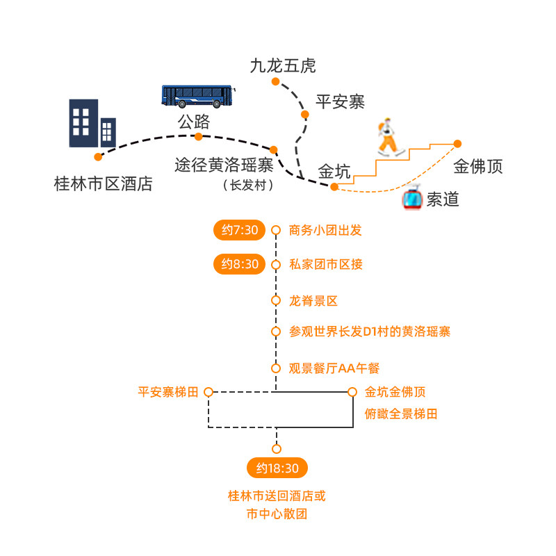 针对商务人士紧凑日程,精心规划桂林市区至龙脊梯田的一日往返行程,全程包车接送,免去公共交通换乘烦恼。清晨出发、傍晚返回,最大化利用白天时间完成梯田观光、古村探访与民俗体验,不影响次日会议或航班安排,真正实现‘出差间隙也能深度度假’的高效差旅理念。
