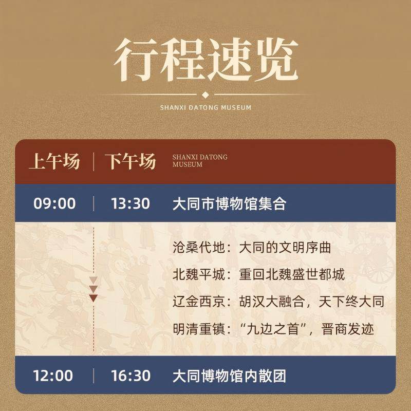 行程仅需半天,完美适配上午会议结束或下午航班前的空档时段。以“历史文化游”为核心标签,聚焦大同作为北魏首都与辽金重镇的独特地位,通过博物馆展品解读古代民族融合与佛教艺术发展。差旅途中也能轻松安排一场有深度的文化短途,提升整体出行品质。