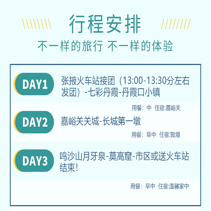 支持从张掖、敦煌市出发,目的地覆盖张掖、嘉峪关、酒泉三地,充分适配西北地区差旅人员的多样化行程需求。无论您是在酒泉参加商务会议,还是在敦煌处理公务,均可就近参团,无缝衔接工作与旅游,省去繁琐交通安排,让差旅效率与旅行品质兼得。