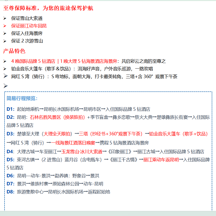 本产品以“云南全景主题游”为核心,将自然、文化、美食、演艺等元素有机整合,帮助差旅人士在有限假期中最大化体验价值。无论您是从天津、济南还是厦门出差结束,均可直接转入此行程,无需额外规划,轻松实现从会议室到雪山洱海的无缝切换。