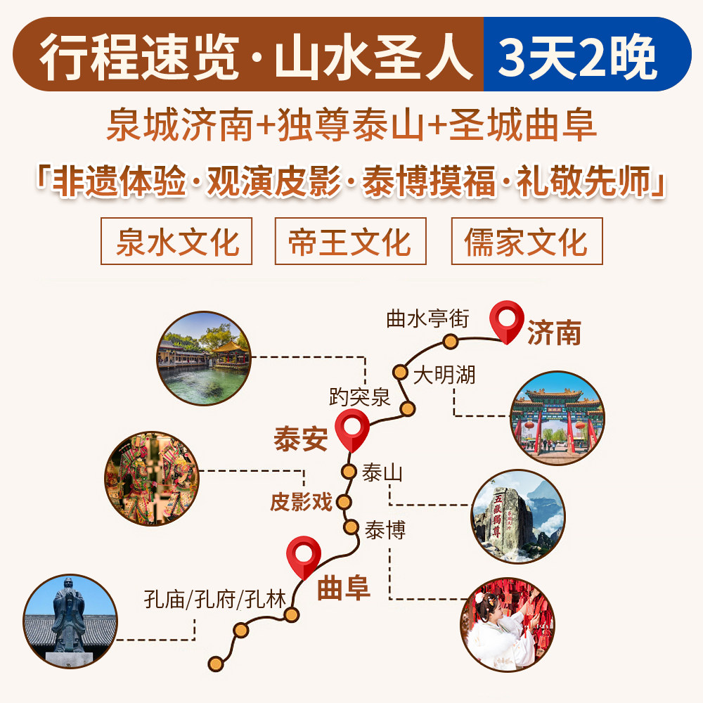 本行程以济南为起点,无缝衔接泰安、济宁两大文化重镇,特别适合从济南出发的商务人士或家庭游客。行程设计紧凑合理,避免冗长交通耗时,最大化利用4天3晚时间深度体验齐鲁文化精髓。无论是出差间隙短途度假,还是周末亲子出行,都能在高效动线中兼顾工作与休闲,实现真正的“差旅融合”。