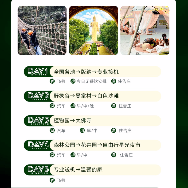 本行程支持1人独立预订,无需拼团等待,特别适合商务人士在差旅间隙安排短途度假。无论是临时出差后的放松调整,还是独自探索西双版纳的热带风情,都能即订即走,灵活高效。小团规模控制在2-12人之间,兼顾私密性与社交感,让您的差旅之余也能享受高品质休闲体验。