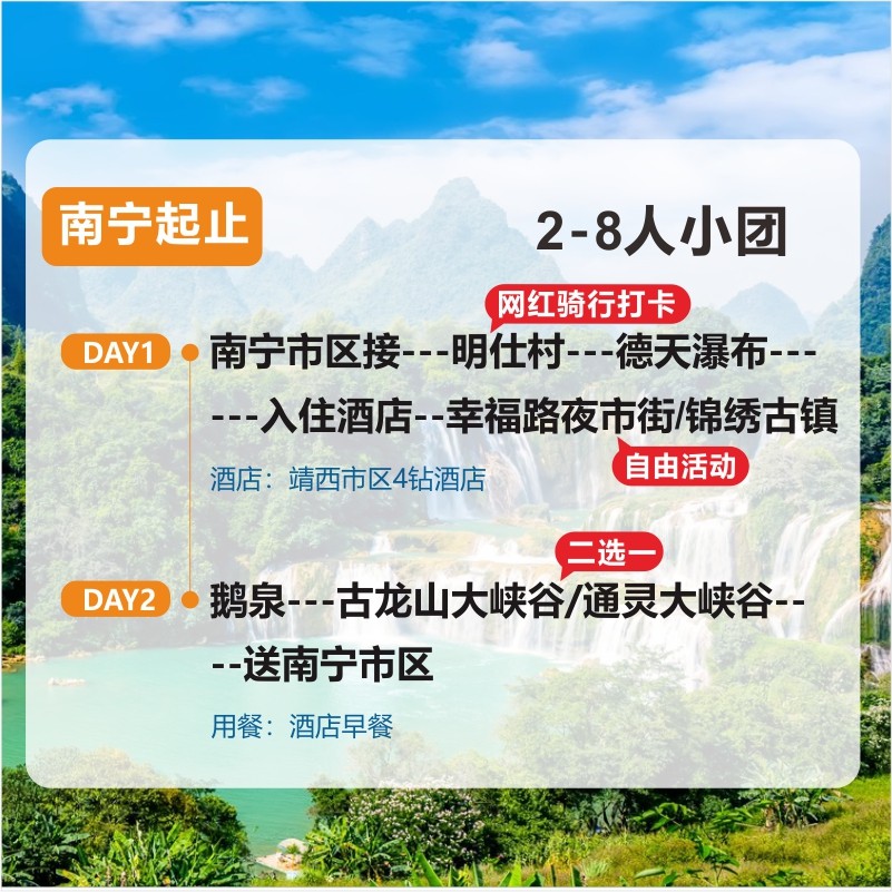 本线路支持单人预订,无需拼团等待,特别适合商务人士在差旅间隙灵活安排短途度假。从南宁或崇左出发,2日行程紧凑高效,既能满足工作需求,又能快速切换至休闲模式,享受德天瀑布、明仕田园等自然人文景观,实现工作与放松的无缝衔接。