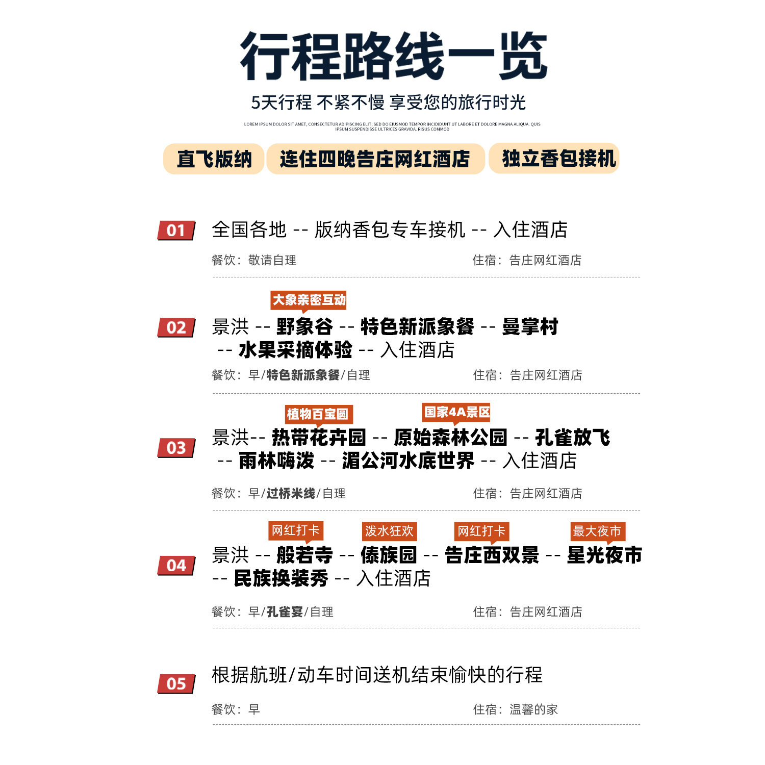 5天4晚的行程科学串联告庄夜市、野象谷、热带植物园、傣族村寨等核心景点,无需自行规划路线或协调交通。对于时间宝贵的差旅人群,这种全包式服务省去琐碎安排,最大化利用有限假期,实现从城市压力到热带慢生活的无缝切换,真正达到‘高效度假’的目的。
