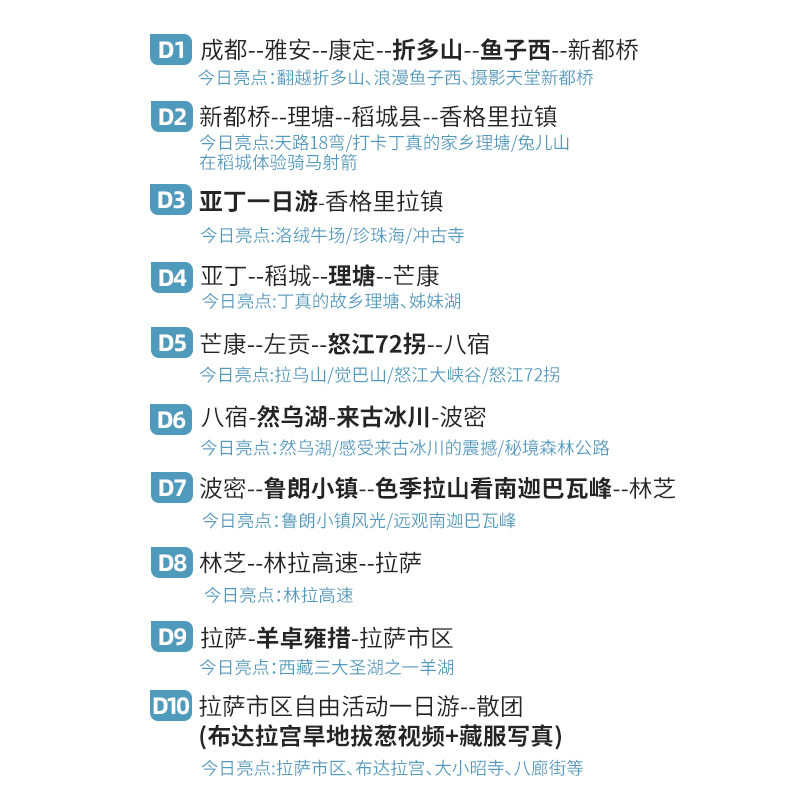 本线路专为从成都出发的差旅及度假人群设计,覆盖拉萨、林芝、山南、甘孜等川藏线精华区域。全程10天9晚,行程节奏合理,兼顾商务人士的时间效率与深度体验需求。无论是结束工作后的放松之旅,还是结合差旅顺道探索高原风光,都能无缝衔接,省去中转烦恼,真正实现‘说走就走’的高原假期。