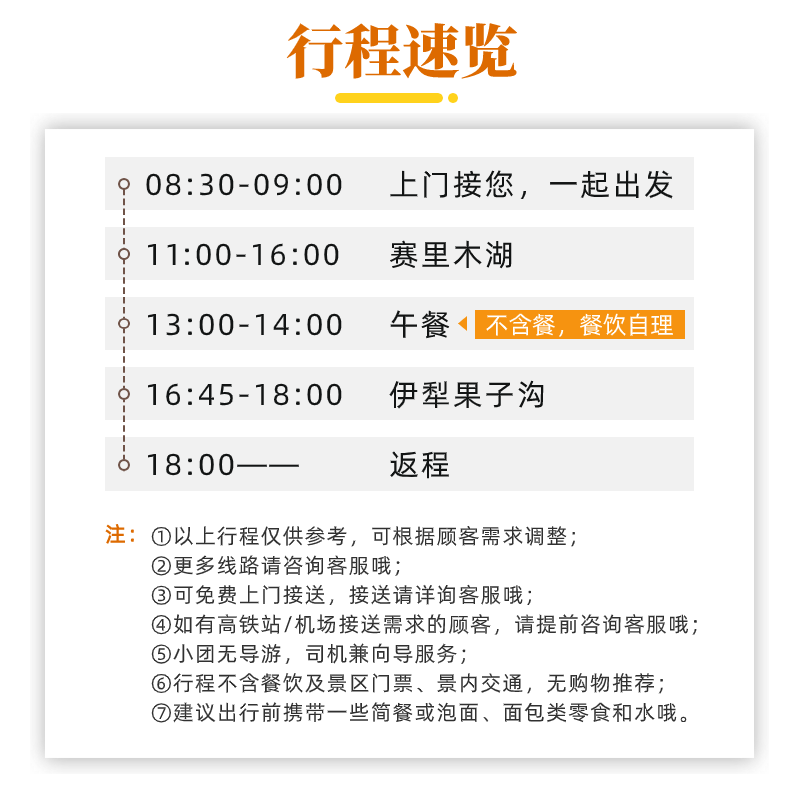 差旅人士时间宝贵且行程多变,本产品提供全程私家包车及可定制化路线服务。您可根据会议结束时间、航班安排或个人兴趣,灵活调整景点停留时长与顺序,例如延长在赛里木湖的摄影时间,或增加果子沟大桥短暂停留。司机兼向导全程配合,确保行程高效且贴合您的实际需求,让短暂假期最大化利用。
