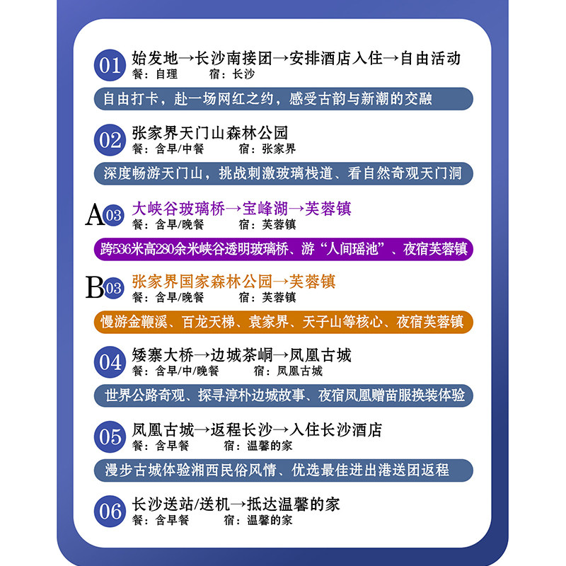 专为差旅人士设计的8天7晚湖南深度行程,从长沙启程,覆盖张家界、凤凰古城、天门山、矮寨大桥等核心景点,全程一价全含,无需额外支出。无论是商务出差后的放松调剂,还是独自出行的高效安排,本线路提供标准化服务与灵活退改政策,确保您的差旅假期无缝衔接、安心无忧。