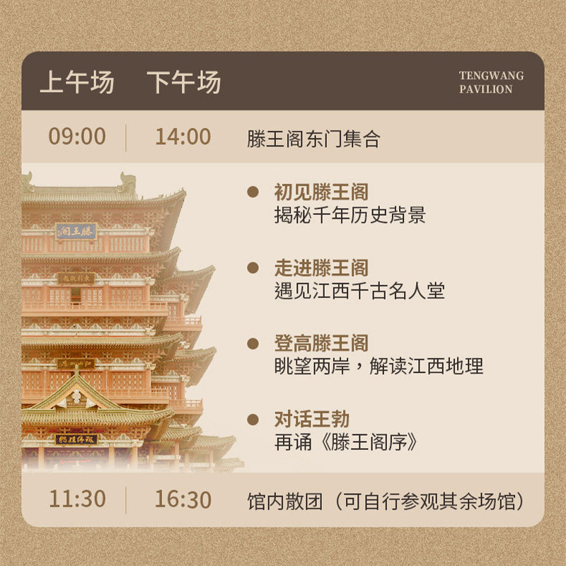 由资深文化讲师带队,讲解内容精炼、逻辑清晰、重点突出,避免冗长铺陈,契合商务人士对高效获取高价值信息的需求。2.5小时内掌握滕王阁的核心历史脉络与文化符号,实现短时高效的知识输入。