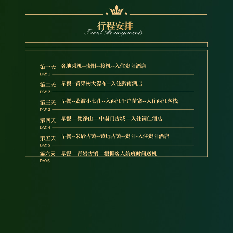 本行程支持北京、上海、广州、深圳等全国28个主要城市直飞贵阳,极大节省差旅人士中转时间与精力。无论您是从华北、华东还是华南出差结束,均可便捷衔接6天5晚的贵州深度度假,实现“工作结束即启程”的高效旅行体验。航班资源丰富,灵活匹配您的差旅日程,让商务与休闲无缝切换。