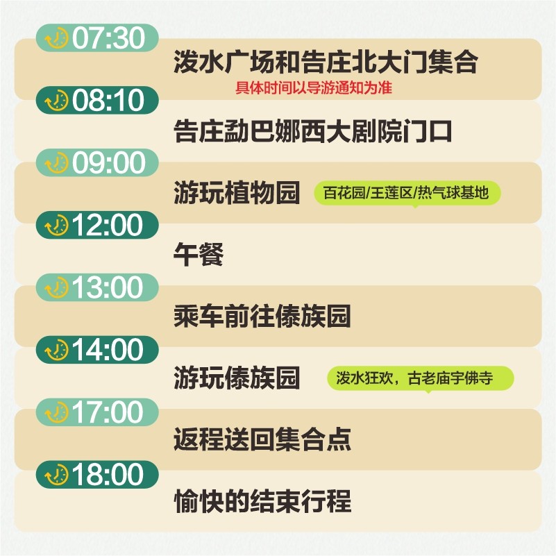 本线路支持单人预订,无需拼团等待,特别适合商务差旅人士在紧凑日程中灵活安排休闲时光。无论您是独自出差至西双版纳,还是临时决定利用空闲时间体验当地风情,只需一键下单即可开启专属一日游。行程设计紧凑高效,上午游览中科院热带植物园,下午沉浸傣族文化,晚上还能品尝地道傣味烧鸡,让差旅之余也能深度感受边陲热带风情,兼顾效率与体验。