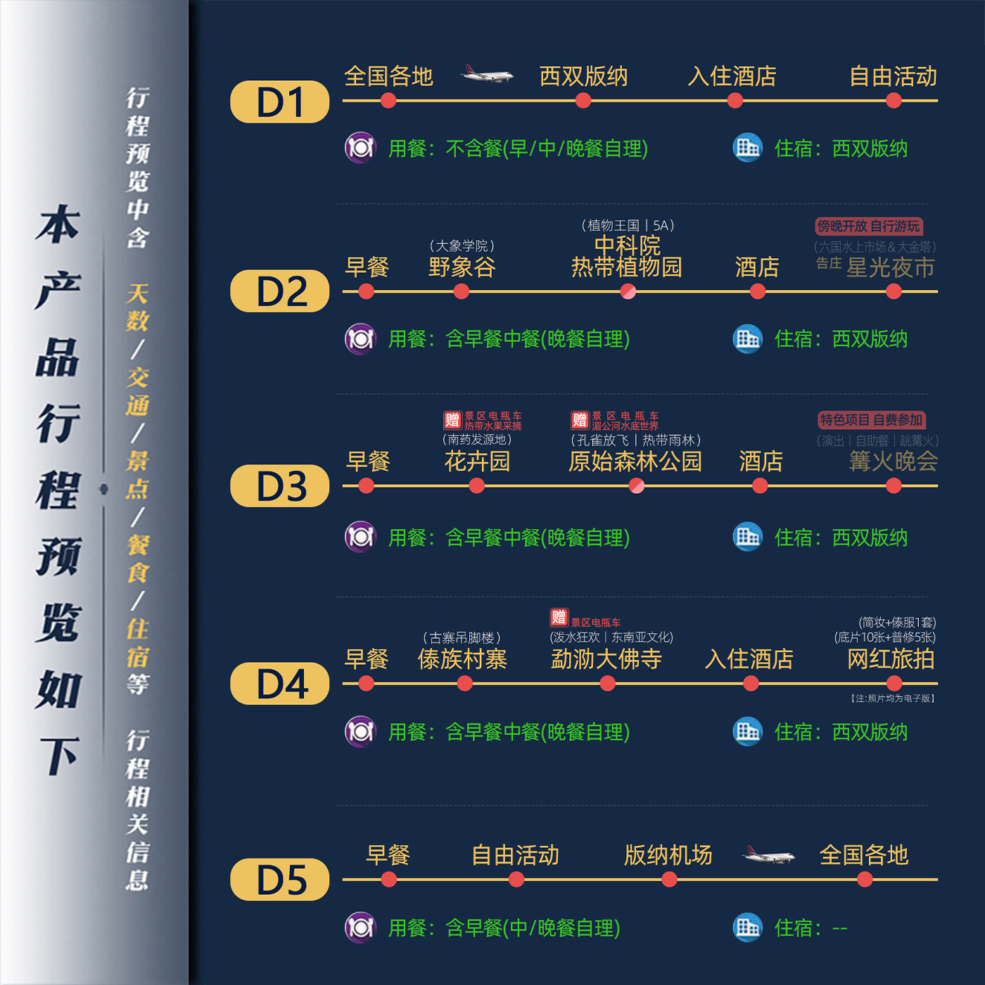 本行程支持单人预订,无需拼团等待,特别适合商务差旅人士在完成工作任务后灵活衔接休闲度假。无论您是独自出差还是临时起意延长假期,都能即刻锁定席位,享受西双版纳的热带风情与民族文化体验,省去协调多人时间的繁琐,让差旅与度假无缝融合。