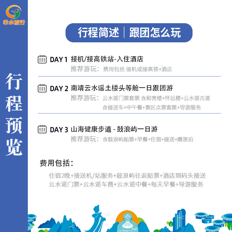 专为差旅人士设计的3天2晚行程,从厦门出发无缝衔接南靖土楼、云水谣古村与鼓浪屿三大核心景点。首日抵达即享接机/接高铁服务并入住酒店,节省通勤时间;次日深入世界文化遗产土楼群,体验客家文化;第三天沉浸鼓浪屿万国建筑与文艺街巷,并赠送专业旅拍服务。全程交通、门票、餐饮、住宿一价全含,让商务出行后的休闲时光高效又轻松。