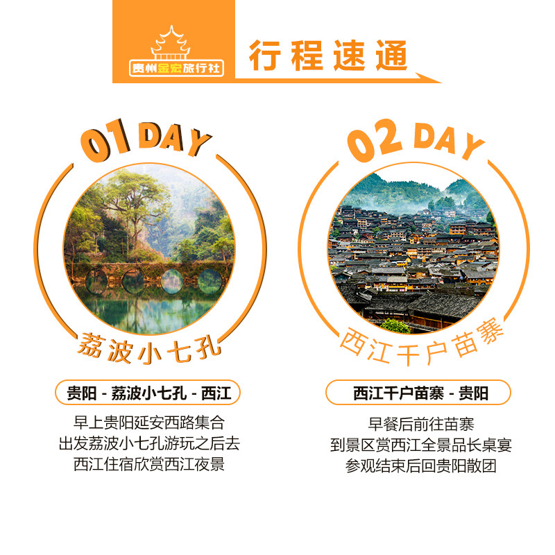 线路以贵阳为起点,充分利用省会城市高铁、机场等交通枢纽优势,方便全国差旅者快速抵达并开启假期。2天1晚设计精准匹配周末或会议间隙,无需额外请假,即可畅游小七孔与千户苗寨两大IP景点,最大化利用碎片化时间,提升差旅附加值。