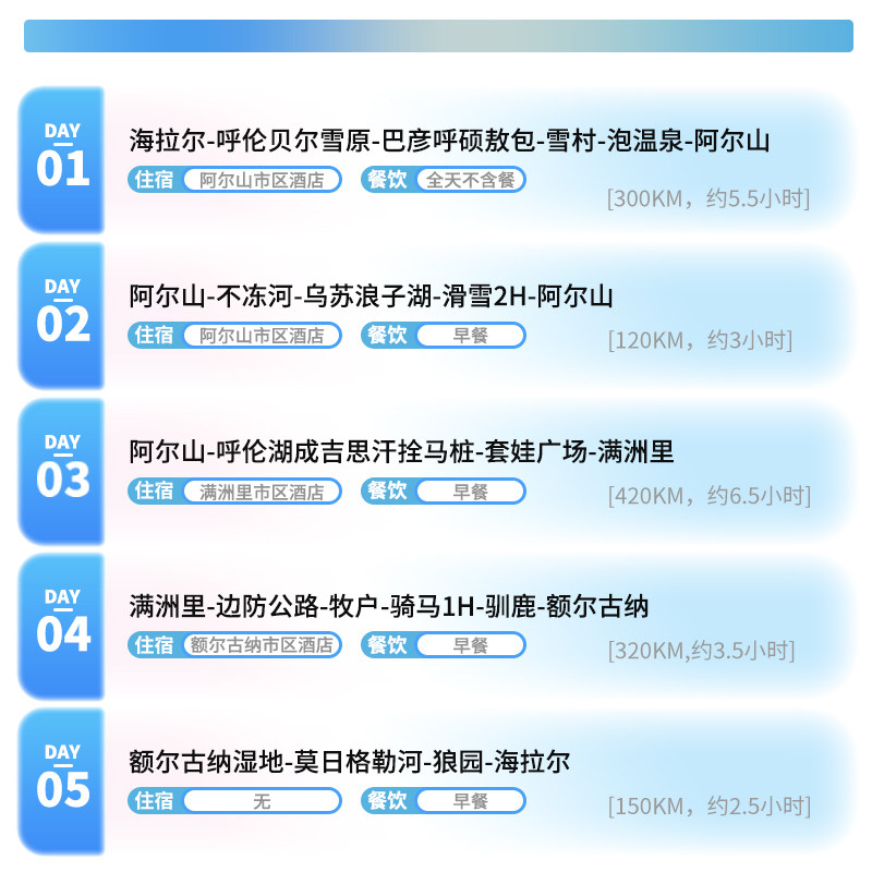 本行程专为兼顾差旅与休闲的旅客设计,7天6晚私家纯玩小团模式,既满足商务人士对行程私密性与灵活性的需求,又融入深度度假体验。从呼伦贝尔出发,覆盖阿尔山、兴安等内蒙古精华区域,全程无购物、无强制消费,适合2人成行,无论是出差间隙放松身心,还是差旅结束后延长假期,都能无缝衔接,高效利用时间享受草原与森林的双重治愈。