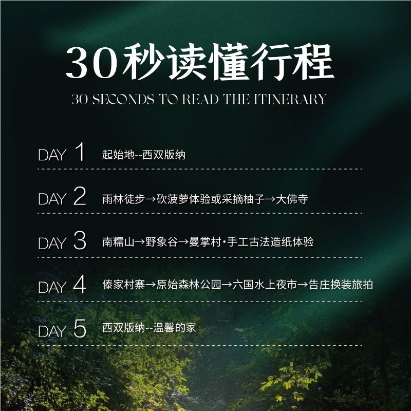 本行程支持1人单独预订,无需拼团等待,特别适合商务差旅人士在会议或工作间隙灵活安排短途度假。西双版纳5天4晚的紧凑设计,既满足深度体验需求,又不占用过多工作时间。无论是临时调休还是周末延伸出行,都能快速成行,高效衔接差旅节奏,实现工作与休闲的无缝切换。