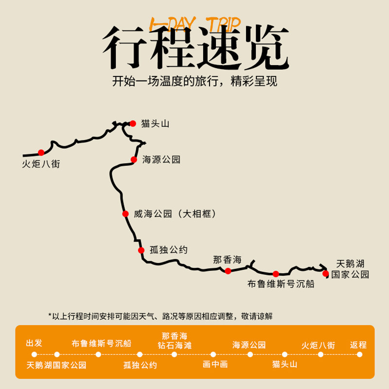 本线路专为差旅人士设计,从威海市区出发,一日内高效串联火炬八街、天鹅湖、大相框、布鲁维斯号沉船及那香海五大网红打卡地。行程紧凑但节奏舒适,上午完成商务会议后即可出发,傍晚返程不耽误次日工作。全程交通接驳便捷,节省中转时间,让差旅之余也能享受高品质度假体验,实现工作与休闲的完美平衡。