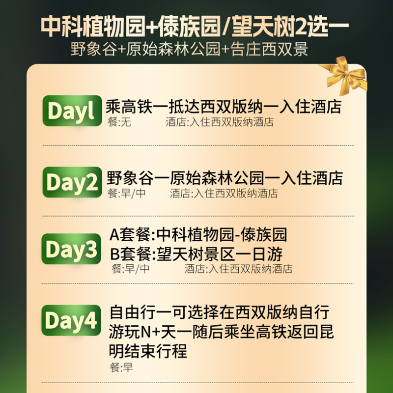 本行程专为差旅人士设计,从昆明便捷出发,无缝衔接西双版纳4日深度体验。无论是结束会议后的放松,还是出差间隙的短途度假,全程交通安排合理、时间紧凑高效,无需额外中转烦恼。特别适合1人单独出行的商务旅客,在繁忙工作之余快速切换至热带雨林的慢节奏生活,兼顾效率与身心疗愈。