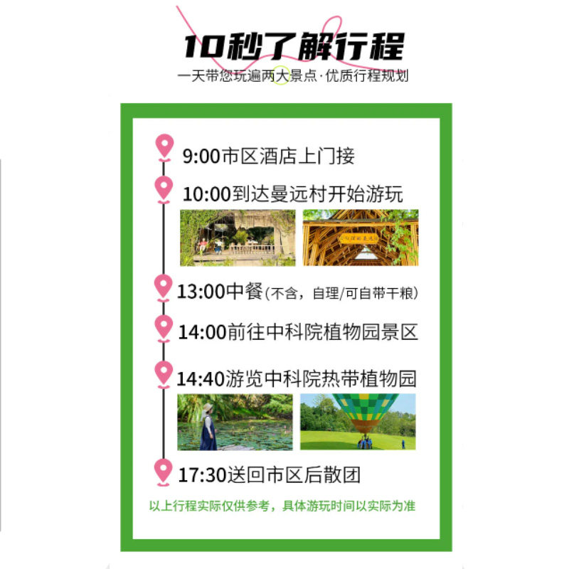 针对时间紧张的商务出行者,本产品采用紧凑高效的一日游结构,无需额外请假或延长差旅周期。早上处理公务,下午沉浸于热带植物园与曼远古村的自然人文之中,傍晚返回住处,轻松实现“工作+微度假”两不误,是差旅期间放松身心的理想选择。