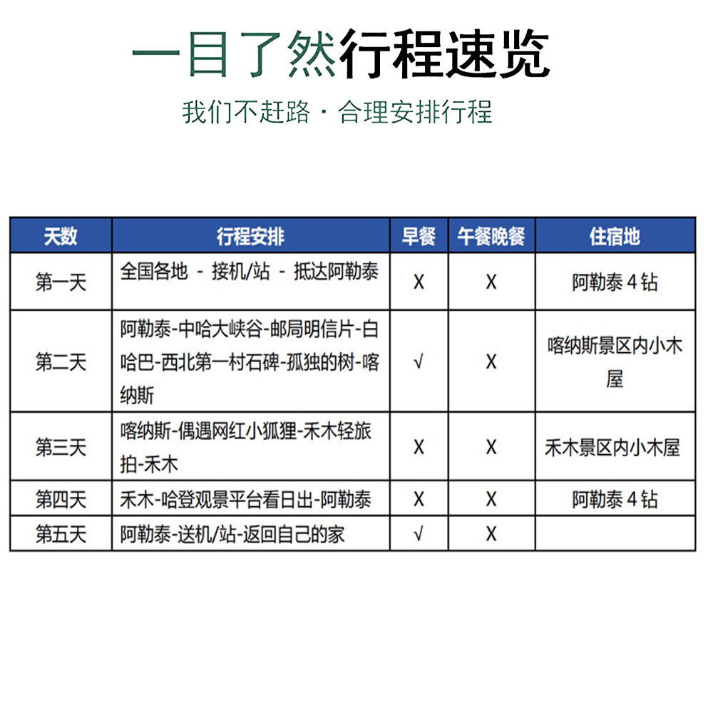 巧妙融合‘滑雪’‘古村’‘星空’三大主题标签,在5日内高效串联阿勒泰核心体验。差旅人士无需多次往返,即可在同一行程中满足运动、文化、摄影、放松等多重需求,实现时间价值最大化,让短暂假期收获远超预期。