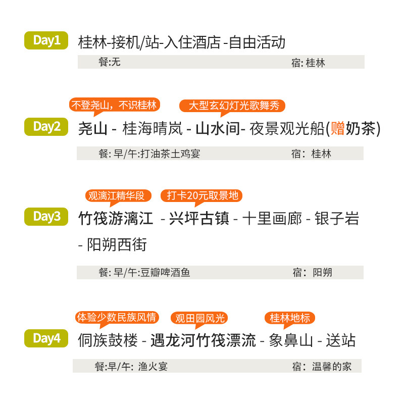 本线路支持单人预订,无需拼团等待,极大提升了差旅人士的时间灵活性。无论是临时出差后的短途放松,还是独自探索桂林山水,都能即订即走。行程安排紧凑合理,4天3晚覆盖象鼻山、遇龙河、龙脊梯田等核心景点,兼顾效率与体验,特别适合商务出行后顺道度假的旅客,让差旅与休闲无缝衔接。