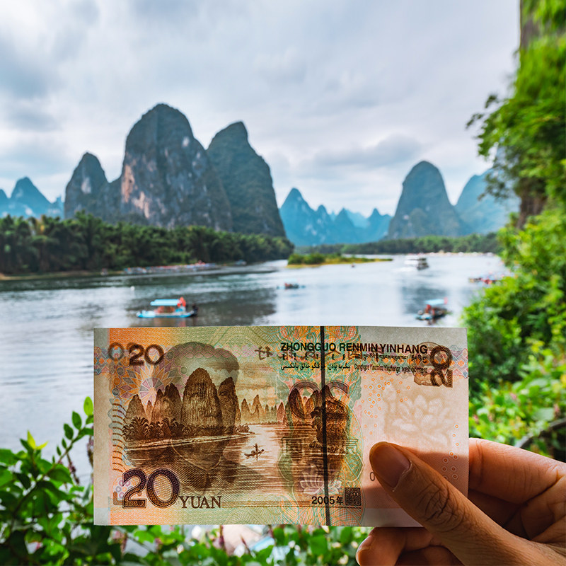 沉浸式漓江游船体验,打卡20元人民币背景地
