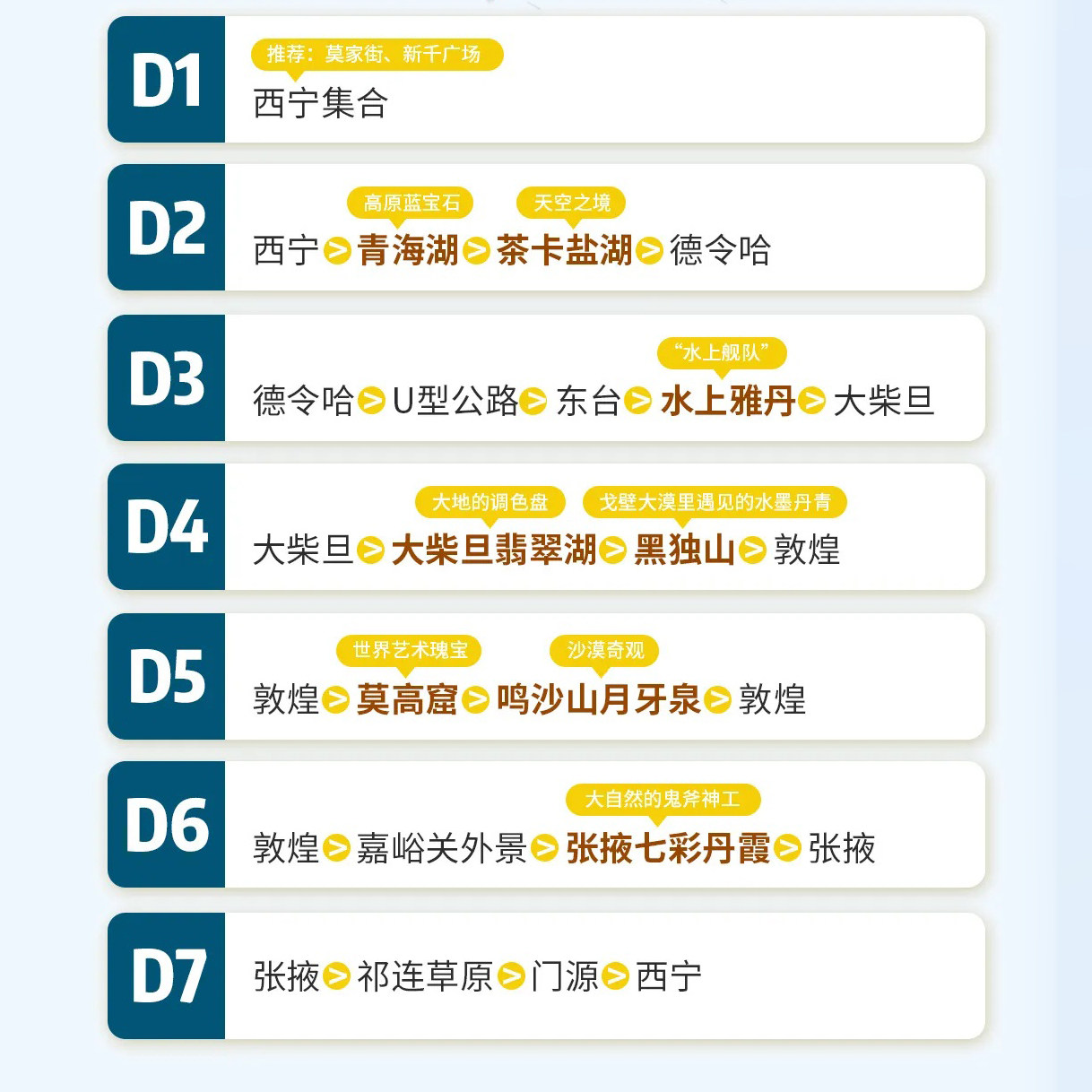 线路精心串联茶卡盐湖、敦煌鸣沙山月牙泉、张掖七彩丹霞、门源油菜花海等网红打卡地,满足差旅人士在有限时间内高效‘集章’的需求。每个目的地均预留充足拍摄与游览时间,确保您既能完成工作任务,又能收获朋友圈高赞内容,让差旅不再单调,而是充满话题性与记忆点。
