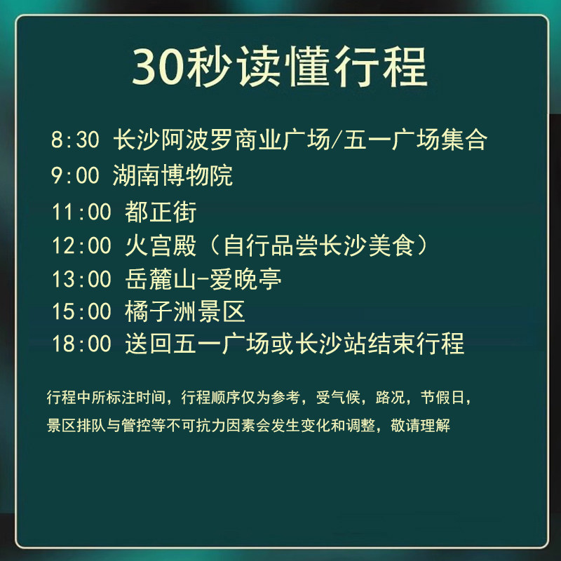区别于普通观光,本产品以‘湖湘文化’为主题串联各大景点,通过专业导游讲述屈贾之乡的历史故事、近代革命风云与湘菜饮食哲学,让差旅不再只是地理位移,而是一次有主题、有脉络的文化沉浸。即使仅有一天时间,也能带走对长沙更立体、更深刻的认知。