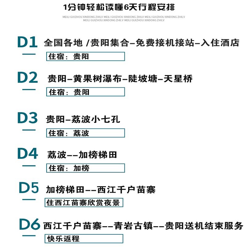 行程以省会贵阳为枢纽,高效串联黔东南、黔南、安顺及贵阳本地四大区域,涵盖黄果树瀑布、小七孔、加榜梯田、西江千户苗寨等核心景点。对于差旅人士而言,无需多次往返中转,6天5晚即可深度体验贵州自然奇观与民族文化,最大化利用有限假期,提升差旅附加值。