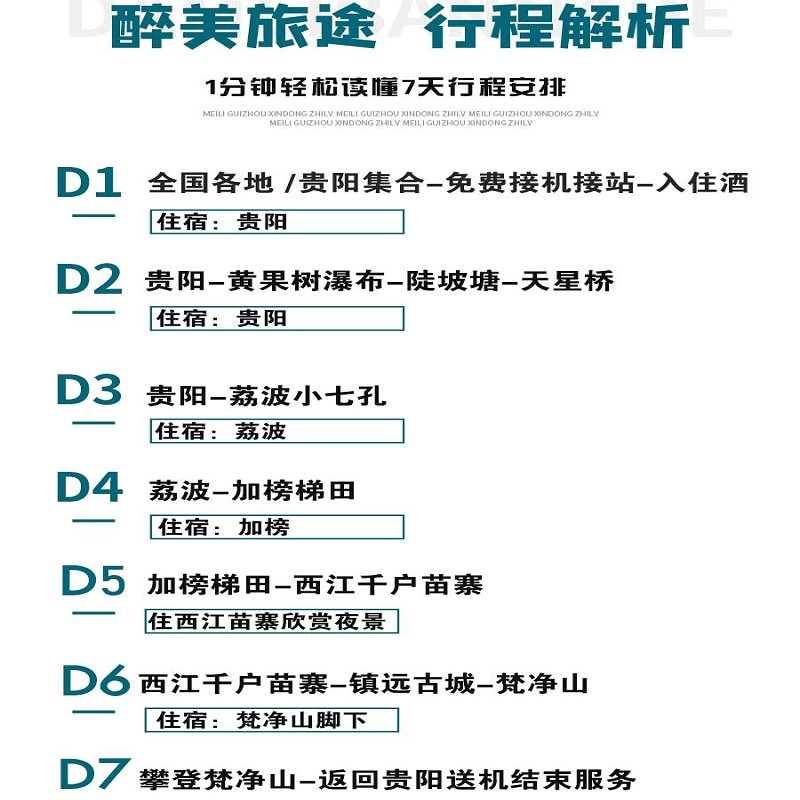 本线路专为差旅人士设计,从贵阳便捷出发,7天6晚高效串联黔东南、黔南、安顺、铜仁四大贵州精华区域。行程涵盖黄果树瀑布、小七孔、加榜梯田、西江千户苗寨及梵净山等核心景点,避免频繁换乘与重复路线,最大化利用有限假期。全程交通接驳顺畅,住宿安排合理,兼顾商务出行的效率与度假体验的深度,是出差之余放松身心的理想选择。