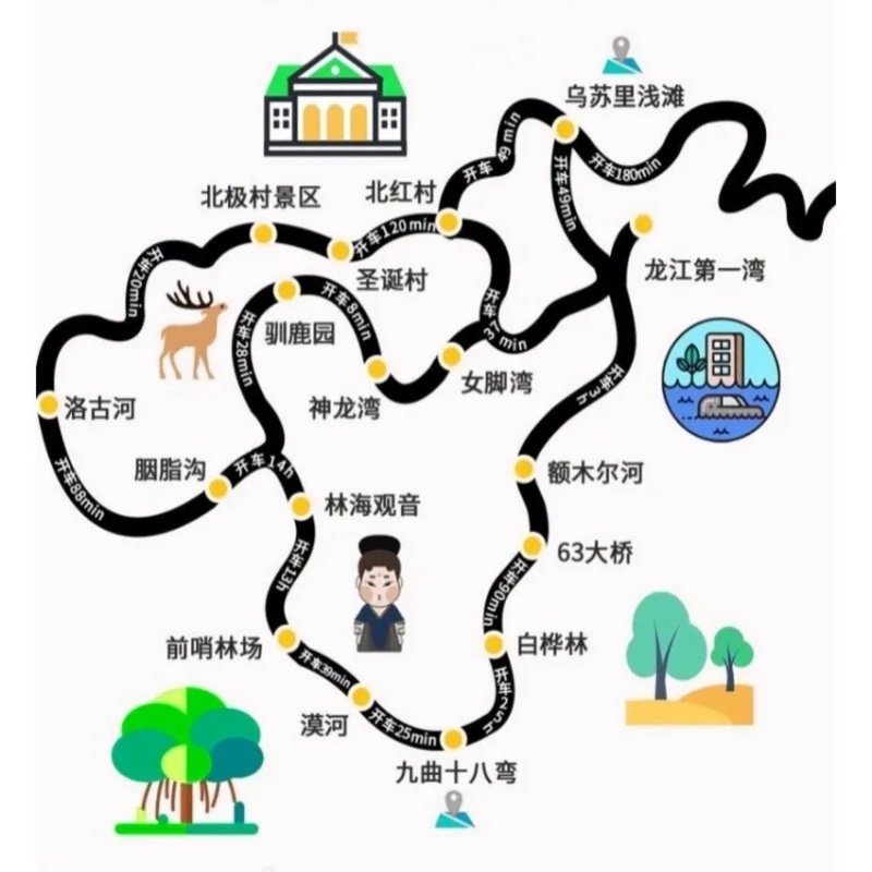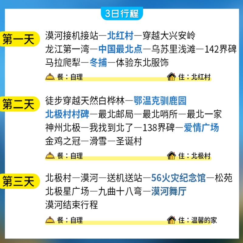行程起点与终点均设于大兴安岭本地,方便从哈尔滨、齐齐哈尔等地乘机或高铁抵达后直接参团,无需辗转多地接送。特别适合利用周末或短假期衔接差旅任务,实现‘落地即游、游完即返’的高效出行闭环。