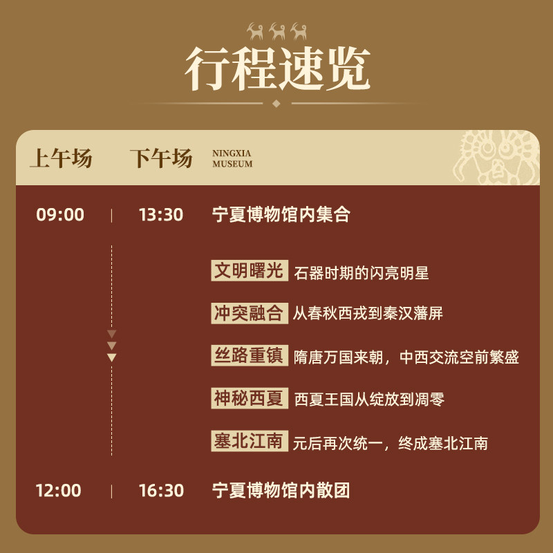 在高效完成工作任务之余,何不赋予差旅更多人文温度?本产品将“逛博物馆”升华为一场有引导、有思考的人文旅行。通过触摸西夏鎏金铜牛、解读神秘西夏文字、欣赏丝路织锦,您将在银川这座塞上湖城中感受历史的厚重与多元文化的交融,让商务出行不再只是奔波,而成为一段有故事的旅程。