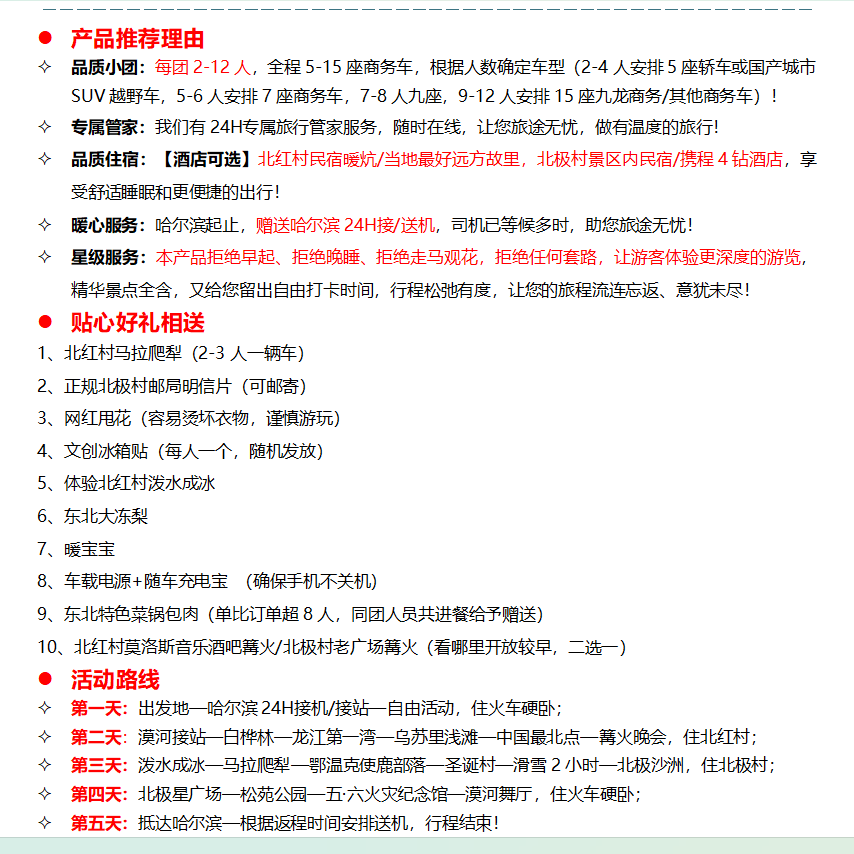 针对差旅人群时间紧张的特点,精心压缩行程至5天,涵盖哈尔滨中央大街、冰雪大世界、漠河北极村、北红村等核心景点,同时安排充足休息与自由活动时间。全程含机票与高品质住宿,省去繁琐比价与预订环节,让您用最短时间获得最完整的东北冰雪体验,高效又充实。