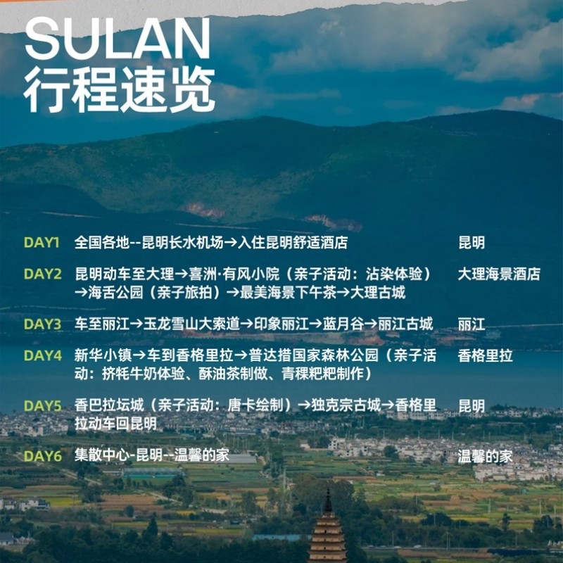 本行程以昆明为起点,科学规划6天5晚路线,无缝衔接大理、丽江、迪庆(香格里拉)三大目的地,避免冗余交通耗时。特别适合家庭在假期或错峰时段出行,兼顾孩子研学需求与家长放松体验。全程精选亲子友好型酒店及景点,减少转场压力,提升差旅效率,让亲子游学更轻松、更充实。