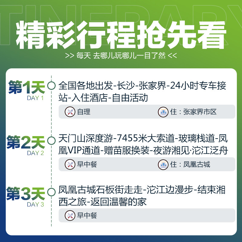针对差旅人群时间紧张的特点,行程精心压缩为3天2晚,首日高铁抵达后直奔天门山,次日畅游张家界国家森林公园及玻璃栈道,第三日转赴凤凰古城并返程。全程交通、门票、住宿一价全含,无需额外操心路线衔接,让您在有限时间内最大化体验湘西自然与人文精华,真正实现‘说走就走’的高效度假。