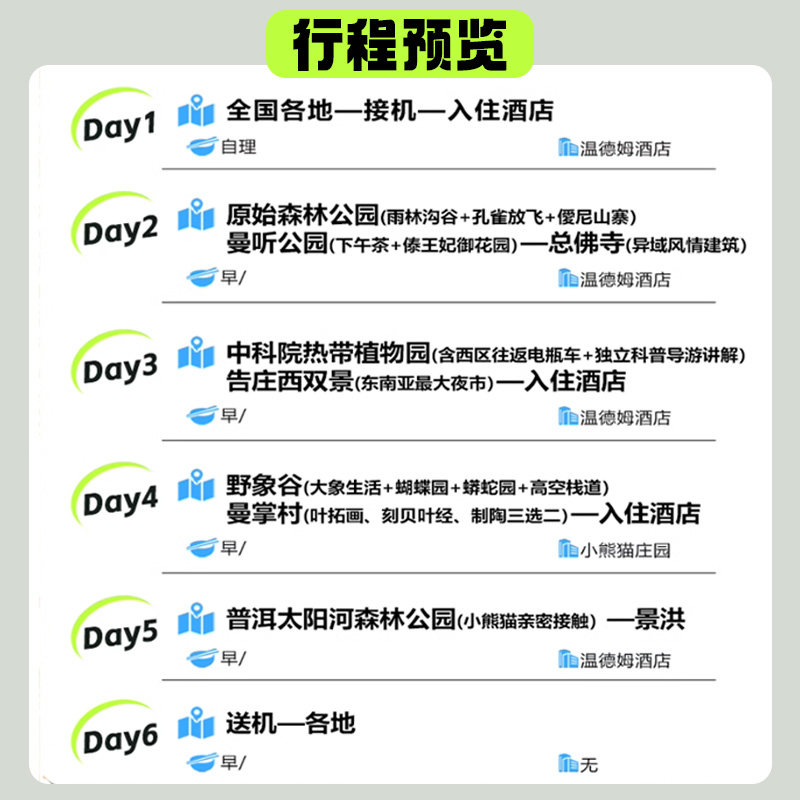 本行程支持单人预订,极大提升了差旅与度假结合的灵活性。无论是商务出差后顺道放松,还是独自带娃开启亲子假期,无需拼团等待,随时成行。特别适合时间紧张但又渴望深度体验西双版纳与普洱热带风情的旅客,兼顾效率与休闲,真正实现“说走就走”的差旅度假新模式。