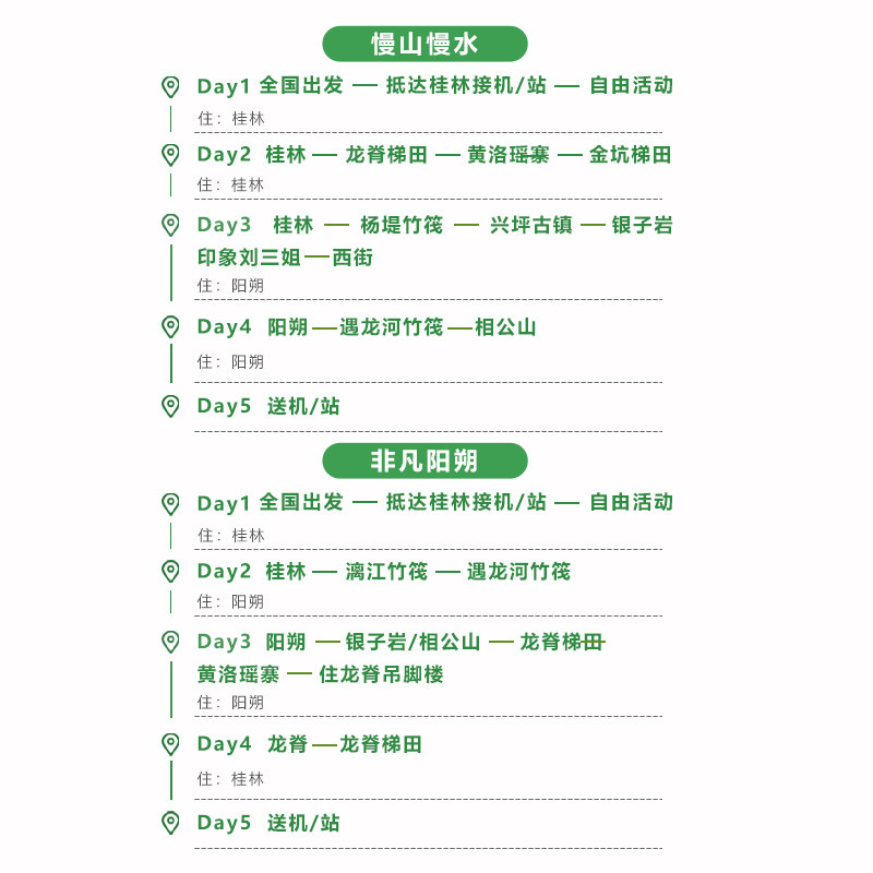 从桂林本地出发的差旅人士可无缝衔接此5天4晚纯玩行程,省去往返大交通耗时。全程无购物、无隐形消费,专注山水与文化体验,最大化利用有限假期。无论是会议结束后的短途放松,还是项目间隙的自我调节,都能在漓江竹筏与龙脊梯田的静谧中快速恢复精力,为后续工作蓄能。