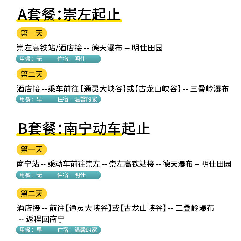 本线路专为差旅人士设计,支持从南宁或崇左两地灵活出发,极大节省往返时间与交通成本。无论是商务出差后顺道放松,还是周末短途度假,2日行程紧凑高效,无需额外中转,全程专车接送,让您的差旅与休闲无缝衔接,轻松实现‘工作+度假’双模式切换。
