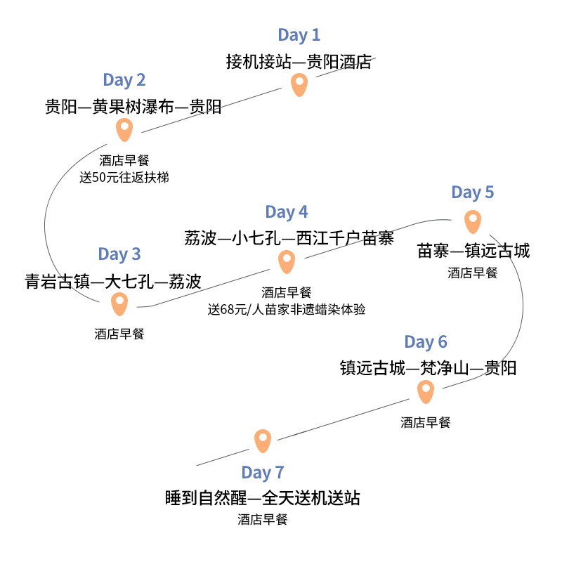 虽为差旅设计,但行程充分考虑家庭出行需求,特别适合携带子女的商务人士。7天6晚的节奏张弛有度,既有黄果树、梵净山等自然奇观激发孩子探索欲,也有古镇慢生活促进亲子互动。半自由行模式保留部分自主时间,便于根据孩子状态灵活调整,实现高效差旅与温馨陪伴的完美平衡。