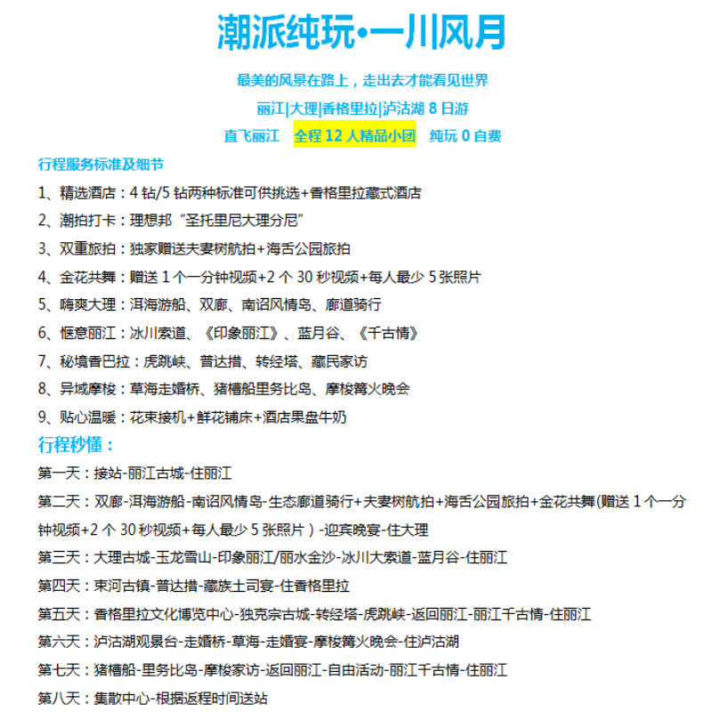 采用12人精品小团模式,避免大型团队的嘈杂与低效,特别适合注重隐私与体验质量的差旅用户。小团更易协调行程节奏,导游服务更专注,确保您在有限假期中高效游览丽江古城、大理洱海、香格里拉等核心景点,最大化时间价值。