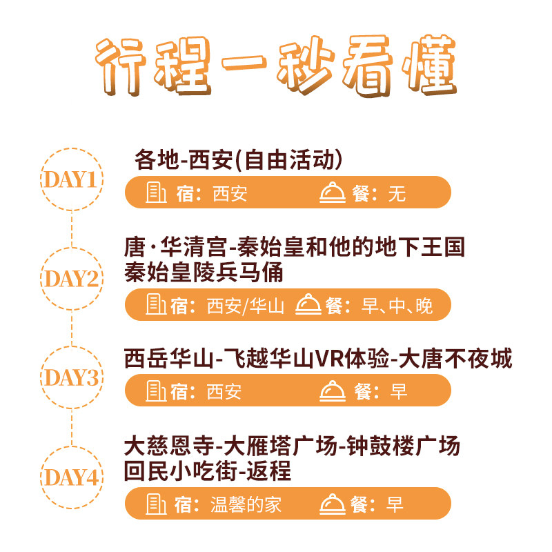 本产品支持1人单独预订,无需拼团等待,特别适合商务出差后顺道度假或独自出行的旅客。行程安排紧凑高效,4天3晚覆盖西安核心景点,包括兵马俑、华山、大唐不夜城等,既满足差旅人士对时间效率的需求,又兼顾深度文化体验,让短暂假期也能收获满满。