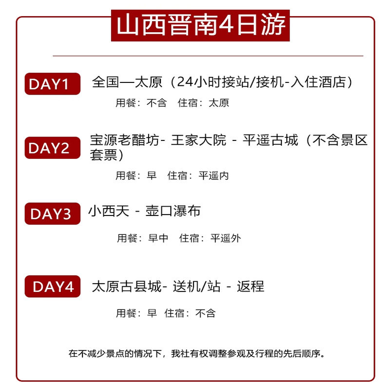 本行程专为差旅人士设计,以省会太原为起止点,交通接驳便利,节省中转时间。4天3晚紧凑安排,涵盖平遥古城、壶口瀑布及小西天等核心景点,兼顾文化体验与自然奇观。无论您是商务出差顺道度假,还是短假出行,都能在有限时间内高效领略山西历史底蕴与壮美风光,实现工作与休闲的完美平衡。