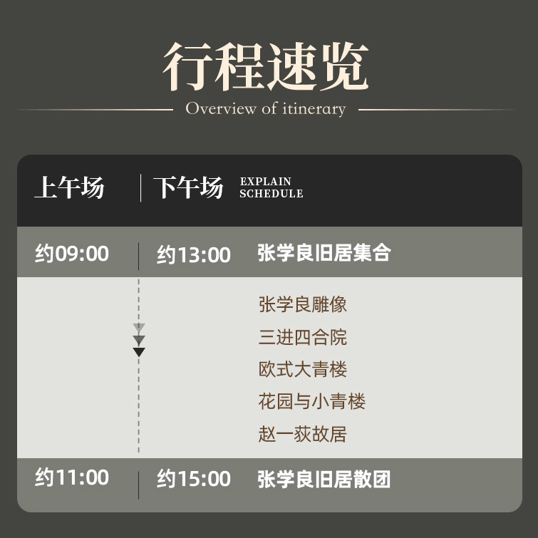 在繁忙差旅中融入高质量文化体验,本行程聚焦张学良旧居这一近代史重要地标,提供专业深度讲解,帮助旅客在短时间内高效获取历史知识。通过沉浸式参观大青楼、了解少帅生平与东北易帜等重大事件,让差旅不再只是奔波,而是一次有深度的人文充电,提升个人文化素养与历史视野。