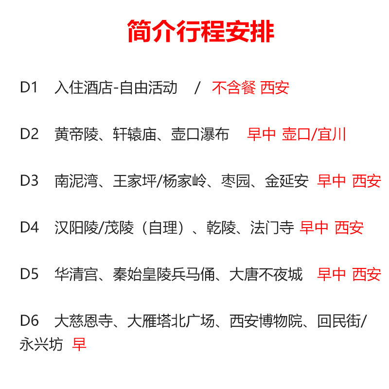 针对经常独自出差的商务人士,本产品支持1人成行,无需拼团等待或承担额外单房差(部分日期可选拼房)。行程安排紧凑而不仓促,兼顾兵马俑、华山、延安等核心景点,让独自出行的您也能高效体验陕西深厚的历史人文,差旅途中不孤单,更有品质保障。
