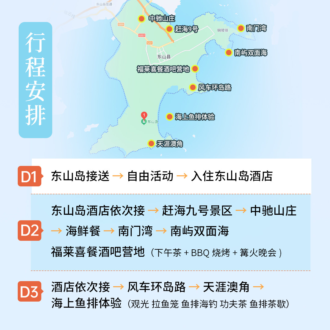 本行程覆盖厦门、漳州、潮州三大城市出发选项,精准对接华南及东南沿海主要商务枢纽。无论是从厦门高崎机场落地,还是从漳州高铁站抵达,亦或从潮汕地区驱车前来,均可快速接入东山岛度假线路。三日时间紧凑高效,适合利用周末或短假期完成一次高品质差旅延伸游。