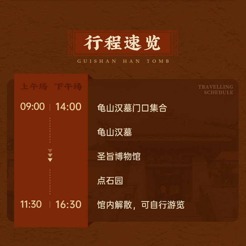 差旅时间宝贵,容不得无效游览。本产品以“龟山汉墓”为核心,围绕汉代陵墓文化深度展开,主题高度聚焦,杜绝走马观花式打卡。2小时行程结构清晰、节奏合理,确保在最短时间内获得最大文化收益,完美契合差旅人士对“精准、高效、有价值”体验的核心诉求。